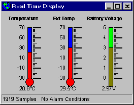 The Status Bar of the Real Time display shows the number of samples held in the Connected Logger and any alarm conditions that may have occurred.