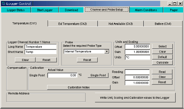 This tab allows the user to specify what probes have been connected to a certain logger. If the logger has inputs that have dedicated probes attached then the software will not allow these to be changed. (See Channel and Probe Setup Overview)