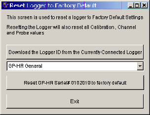 The Reset to Factory Default function is used to reset all configuration and calibration settings within the logger.