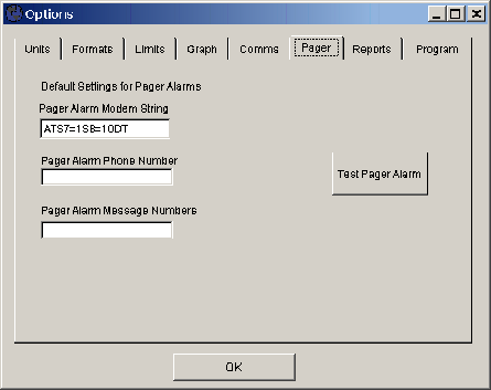 The Pager Tab is used to set up default values for the programming of Pocket Pager Alarms. This Tab is used to enter the default values that will appear in the Pager Alarm Modem String area of the Pager Tab of the Logger Control Screen. These values can be changed for a particular logger before it is programmed.