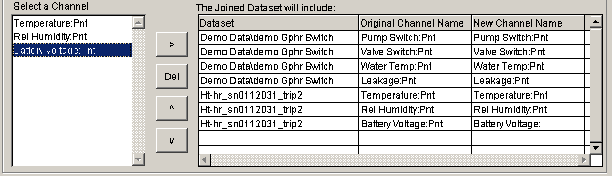 Once the time base has been selected, the user selects the datasets that are to joined then selects channels from the datasets and moves these channels to the Joined Dataset grid using the mover buttons.