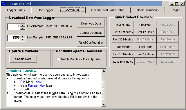 Some loggers will only allow you to download all available data. In this case the First Sample and Last Sample Number, Date and Time will be displayed but can not be changed. These loggers do not allow a “Cancel Download” once a download has been started so the only options available are “Download Data” and “Read Configuration”