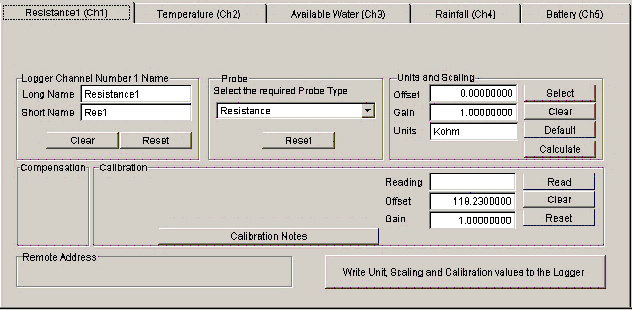 The value in Kohms is then entered into the Offset box in the calibration area. eg, If the read resistance is 118.23Kohms then 118.23 is entered as the Calibration offset as shown below: